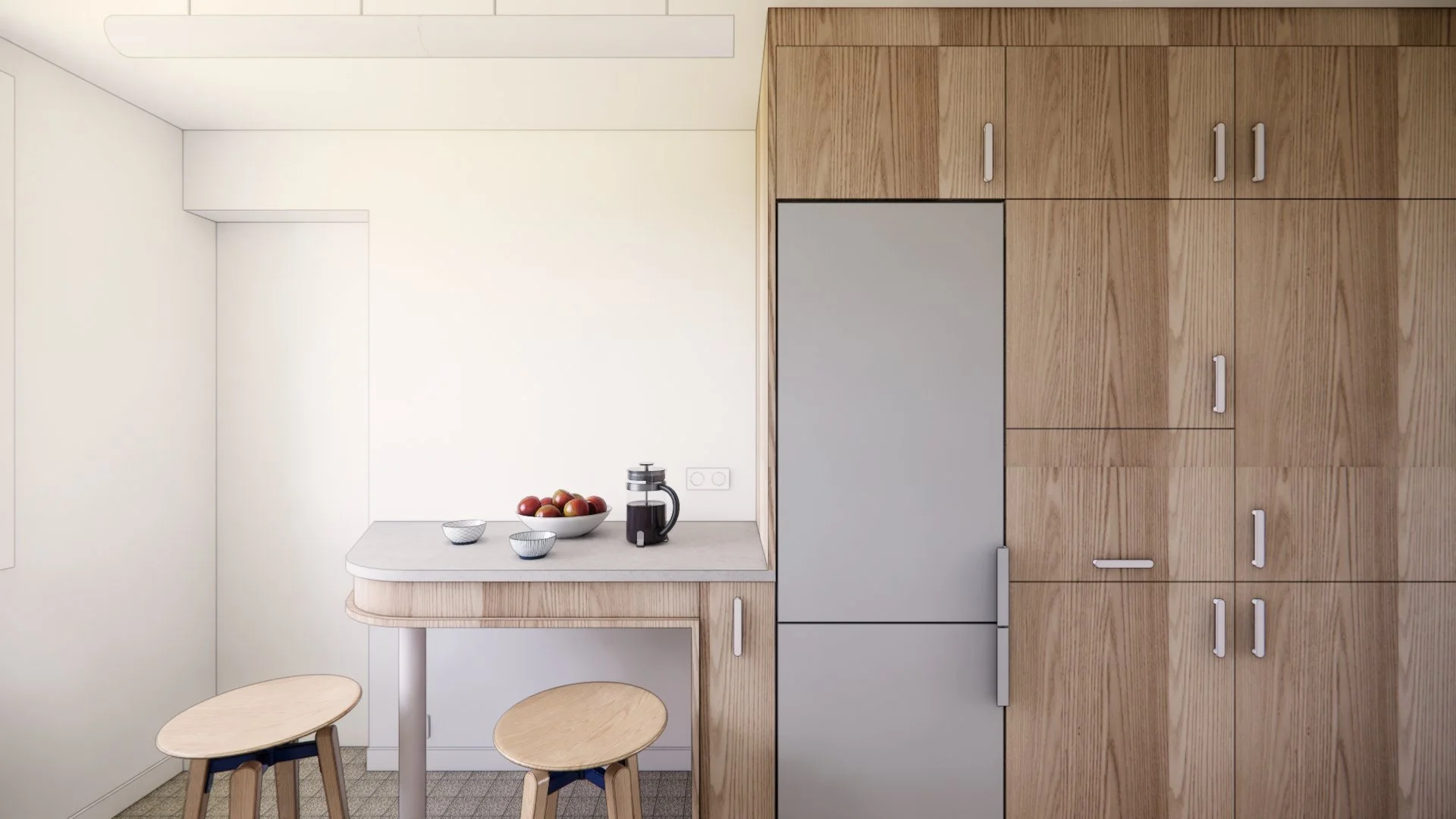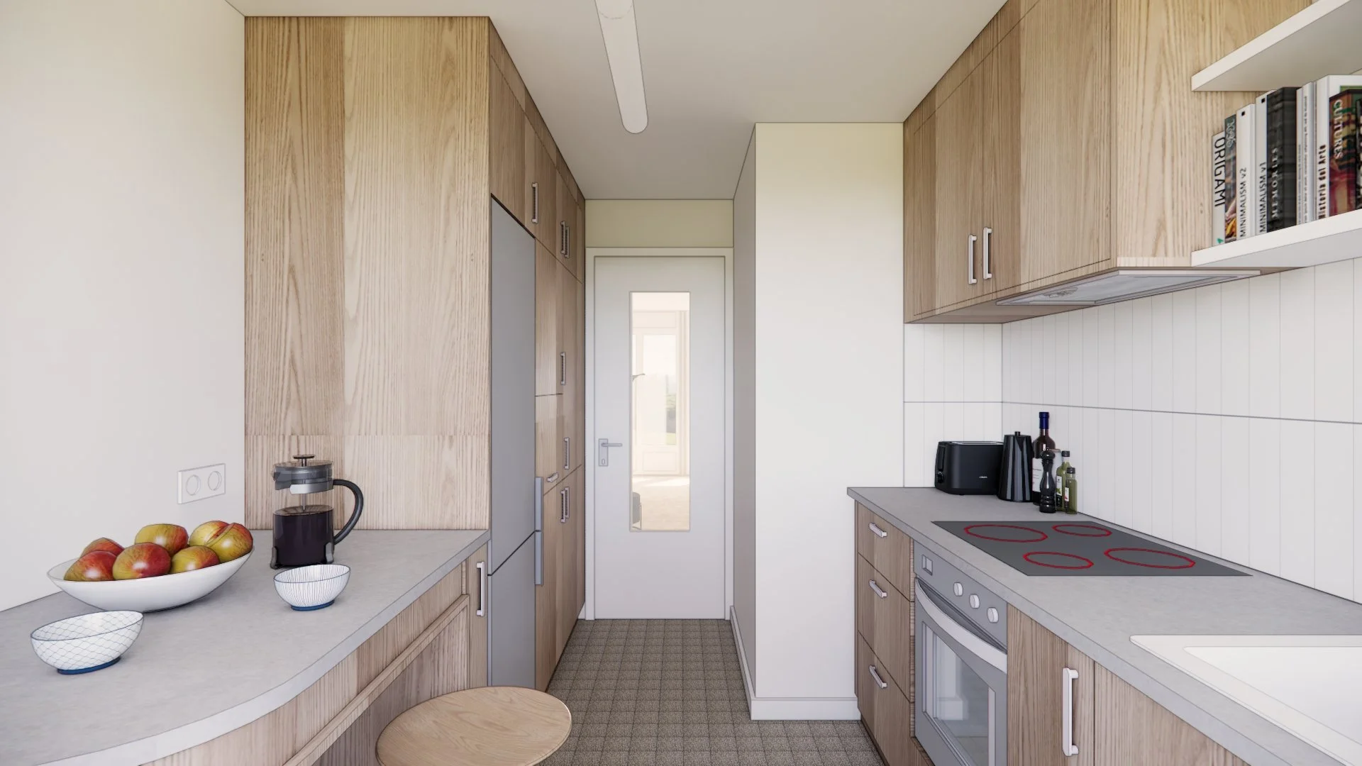 Réaménagement d’une cuisine, d’une surface d’environ 9,40 m2. Dessin du mobilier sur-mesure répondant aux besoins du client et aux diverses contraintes de la pièce (réseaux existants, faible largeur, sol à conserver...). Accompagnement auprès du client dans le choix des finitions (mobilier sur-mesure, luminaire, assises...).