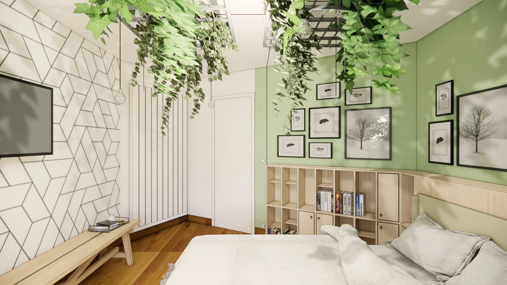 Réaménagement d’une chambre d’adolescent, d’une surface d’environ 14,50 m2. Dessin du mobilier sur-mesure répondant aux besoins du client et aux diverses contraintes de la pièce (réseaux existants, forme biaise...). Accompagnement auprès du client dans le choix des finitions (mobilier sur-mesure, luminaire, décoration...).