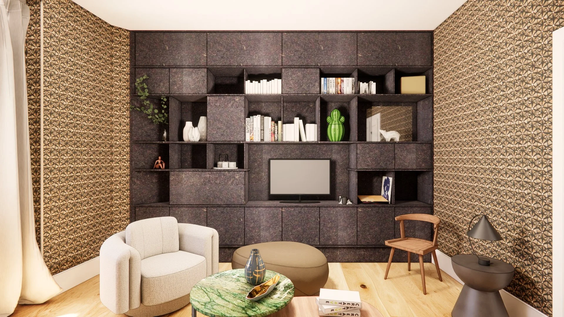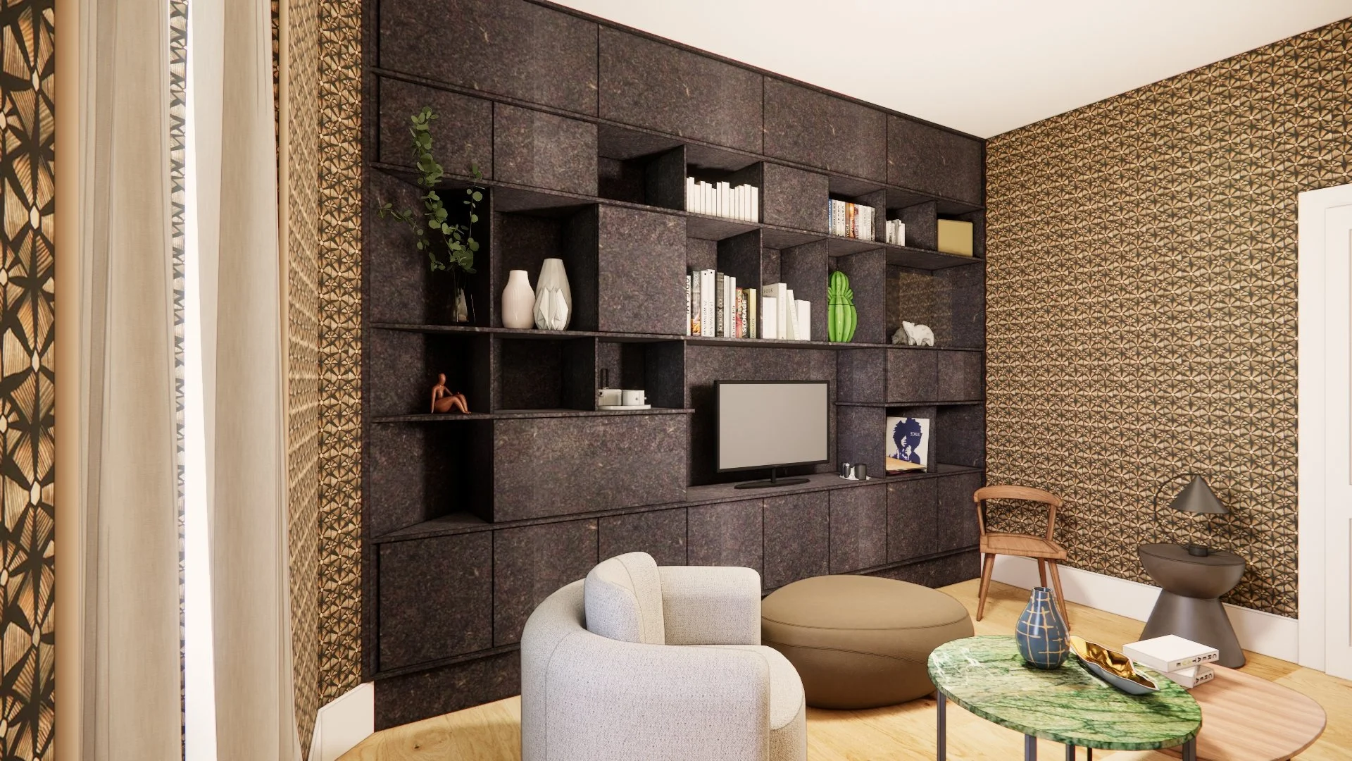 Réaménagement d’un salon, d’une surface d’environ 17,70 m2. Dessin du mobilier sur-mesure répondant aux besoins des clients et aux diverses contraintes de la pièce (réseaux existants, linéaire à meubler, sol à conserver...). Accompagnement auprès des clients dans le choix des finitions (mobilier sur-mesure, papier peint...).